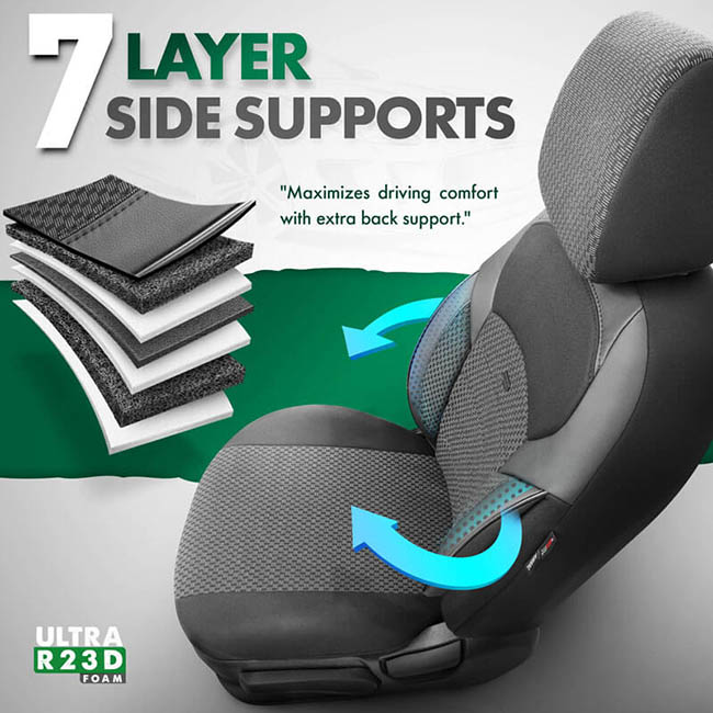 Extra Supportive 7 Layers: Ορθοπεδικός σχεδιασμός 7 στρώσεων στα πλαϊνά ώστε να παρέχεται στήριξη στην πλάτη και τη μέση . Προλαμβάνει τον πόνο και αυξάνει την οδηγική άνεση.