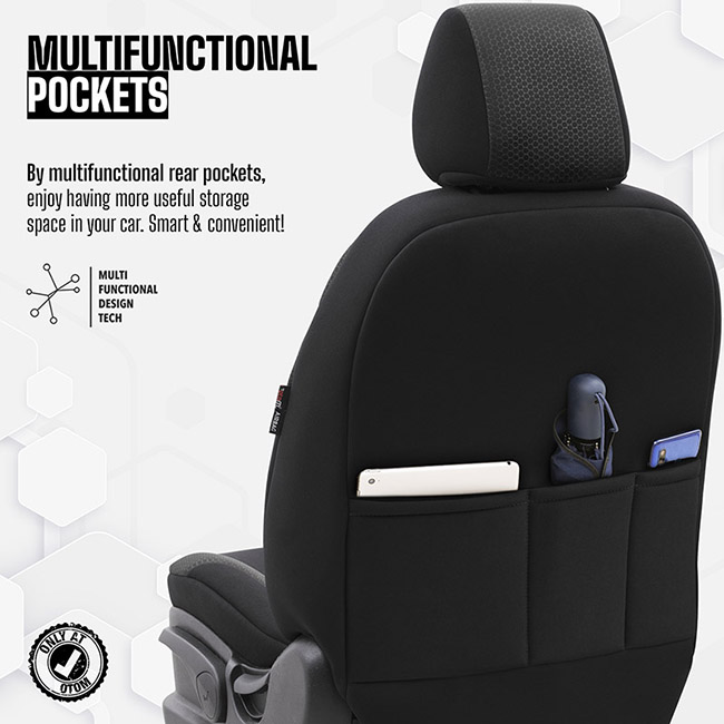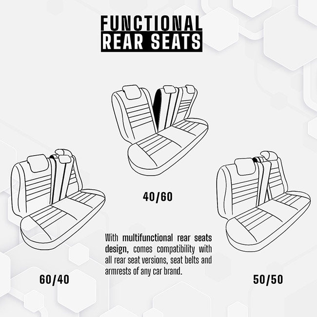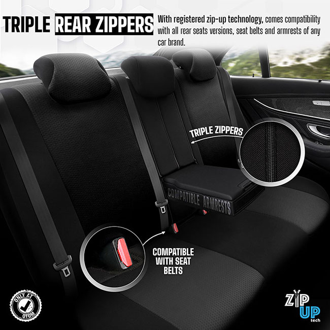 Zip-up Tech:  Διαθέτουν 3 φερμουάρ ώστε να προσαρμόζονται στα πίσω καθίσματα είτε είναι διαιρούμενα 60-40, είτε 40-60 είτε 50-50.