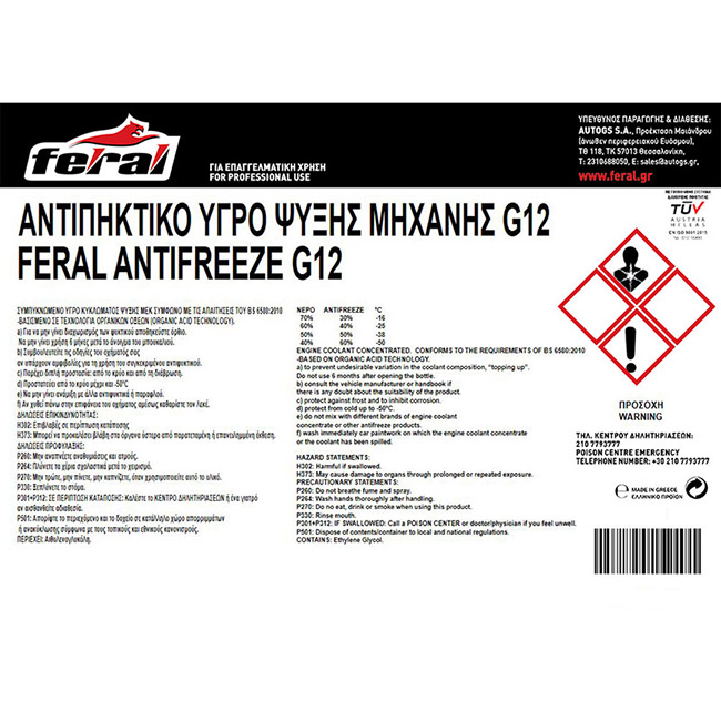 Το παραφλού G12 της FERAL προστατεύει το κύκλωμα ψύξης του αυτοκινήτου όλο τον χρόνο. Προσφέρει εξαιρετική αντισκωριακή προστασία και βοηθά στο να αποτραπεί το πάγωμα σε ψυχρό καιρό έως -50 ºC και την υπερθέρμανση σε ζεστό καιρό έως +105 ºC.