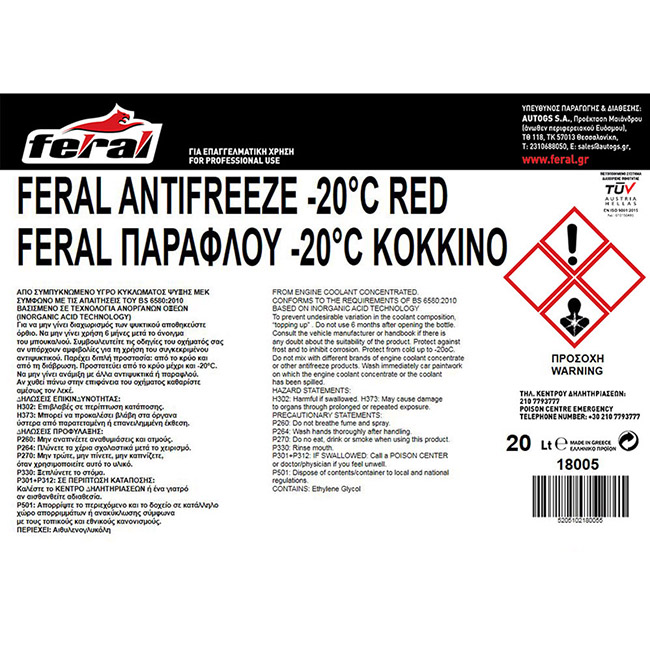 Το παραφλού FERAL προστατεύει το κύκλωμα ψύξης του αυτοκινήτου όλο τον χρόνο. Προσφέρει εξαιρετική αντισκωριακή προστασία και αποτρέπει το πάγωμα σε ψυχρό καιρό έως -20 ºC και την υπερθέρμανση σε ζεστό καιρό έως +108 ºC.