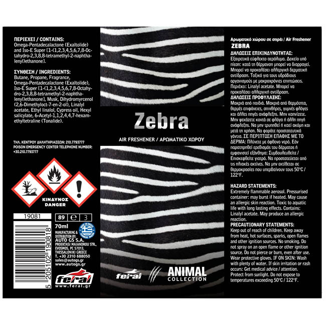 Αρωματικό Αυτοκινήτου Spray Feral Animal Collection Zebra 1 Τεμάχιο