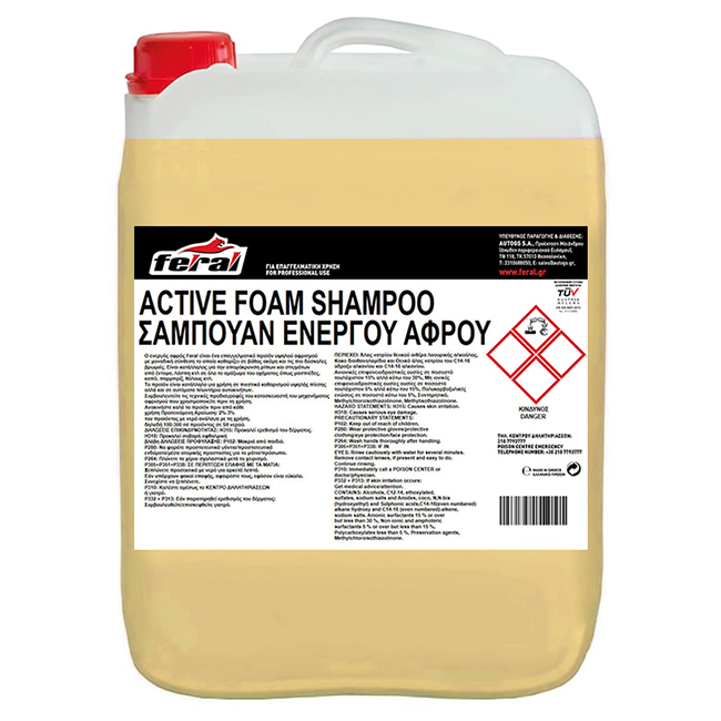 Το Σαμπουάν Αυτοκινήτου Ενεργού Αφρού Feral είναι ένα επαγγελματικό προϊόν υψηλού αφρισμού, με μοναδική σύνθεση το οποίο καθαρίζει σε βάθος, ακόμη και τις πιο δύσκολες βρωμιές. Είναι κατάλληλος για την απομάκρυνση ρίπων και στιγμάτων από έντομα, λάσπη κτλ σε όλο το αμάξωμα του οχήματος, όπως μασπιέδες, καπό, παρμπρίζ, θόλους κτλ. Το προϊόν είναι κατάλληλο για χρήση σε πιεστικά καθαρισμού υψηλής πίεσης, αλλά και σε αυτόματα πλυντήρια αυτοκινήτων. Διατίθεται και με άρωμα BUBBLE.