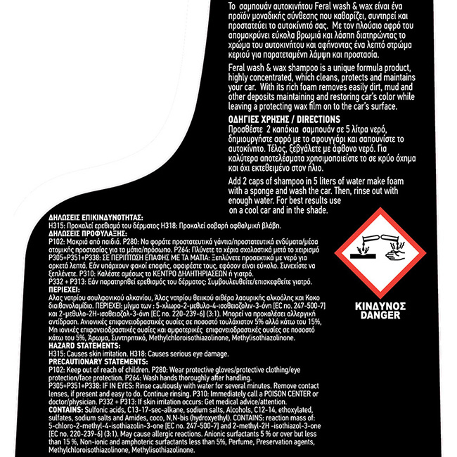 Το Σαμπουάν Αυτοκινήτου Feral Wash & Wax είναι ένα προϊόν μοναδικής σύνθεσης που καθαρίζει, συντηρεί και προστατεύει το αυτοκίνητο σας. Χάρη στον πλούσιο αφρό του, απομακρύνει εύκολα βρωμιά και λάσπη, διατηρώντας το χρώμα του αυτοκινήτου και αφήνοντας ένα λεπτό στρώμα κεριού για παρατεταμένη λάμψη και προστασία. Επιπλέον, ξεπλένετε εύκολα, αφήνοντας καθαρή επιφάνεια και προσφέροντας προστασία από τη σκόνη, τον ήλιο και τη βροχή. Το μεγάλο πλεονέκτημα αυτού του σαμπουάν είναι πως μετά την χρήση του προσφέρει αποτέλεσμα μακράς διάρκειας και δεν χρειάζεται επιπλέον κέρωμα ή άλλη αλοιφή ώστε να αναδείξει το χρώμα και την λάμψη του αυτοκινήτου σας.