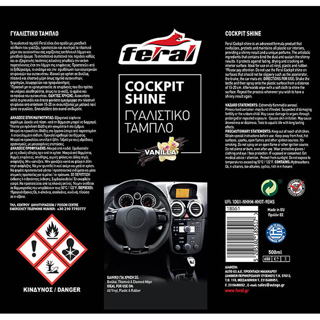 Το γυαλιστικό ταμπλό Feral, είναι ένα προϊόν με μοναδική σύνθεση που γυαλίζει, προστατεύει και συντηρεί τα πλαστικά μέρη του αυτοκινήτου σας χαρίζοντας εκπληκτική λάμψη, και μοναδικό άρωμα. Τα αντιστατικά συστατικά που περιέχει καθώς και οι εξαιρετικής ποιότητος σιλικόνες απωθούν την σκόνη παρατείνοντας έτσι την λάμψη της επιφάνειας.Προστατεύει από το ξεθώριασμα, το σκάσιμο και την αφυδάτωση των εσωτερικών επιφανειών του αυτοκινήτου. Ιδανικό για χρήση σε βινύλια, πλαστικά και ελαστικά μέρη όπως ταμπλό αυτοκινήτων, φορτηγών, λεωφορείων και προφυλακτήρες.