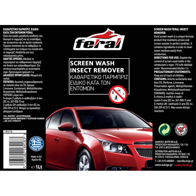 Το Καθαριστικό Παμπρίζ κατά των Εντόμων Mix της Feral διατηρεί το παρμπρίζ του αυτοκινήτου σε άριστη κατάσταση ενώ ταυτόχρονα αφαιρεί την βρωμιά και τα σημάδια των εντόμων που έλκονται από το παρμπρίζ.