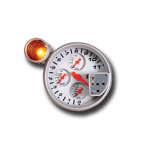 Το Όργανο 4 σε 1 Auto Gauge με shift light είναι ένα πρωτοποριακό όργανο μέτρησης, το οποίο έχει διάμετρο 5 inches. Αποτελείται από: 1. Στροφόμετρο με μέγιστη ένδειξη 11.000 στροφές. 2. Όργανο Πίεσης Λαδιού μέχρι 7 bar. 3. Όργανο Θερμοκρασίας Νερού έως 120ο C. 4. Όργανο Θερμοκρασίας λαδιού έως 150ο C. Επίσης, διαθέτει φωτεινή ένδειξη για αλλαγή ταχύτητας όταν οι στροφές ξεπεράσουν το επιτρεπτό όριο το οποίο έχει καθορίσει ο χρήστης από το ειδικό διακοπτάκι.