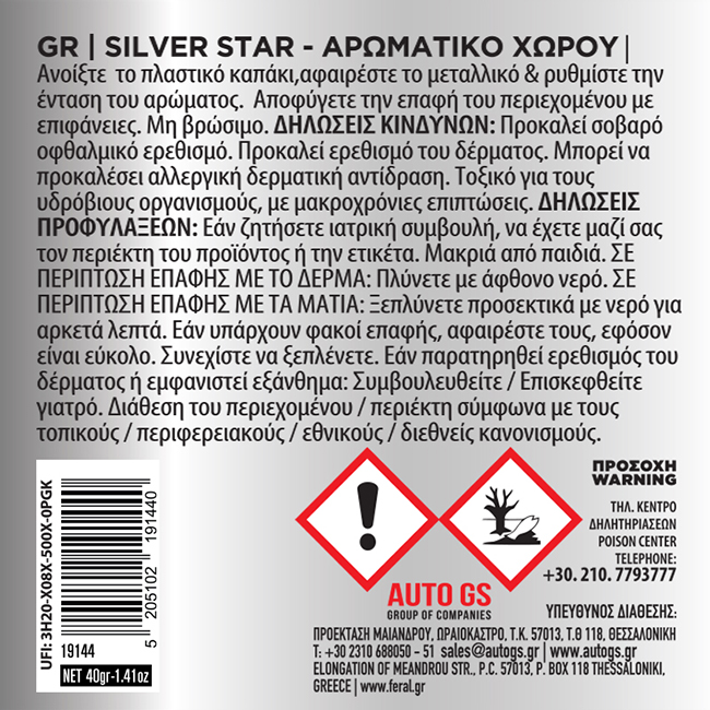 Το οργανικό αποσμητικό χώρου Feral έχει ως βάση οργανικές ίνες, εμποτισμένες με άρωμα, που δίνει στο περιβάλλον σας αναζωογονητικές μυρωδιές της φύσης. Το αρωματικό Silver Star σε συσκευασία κονσέρβας, απευθύνεται σε εκείνους που θέλουν μοναδικά αρώματα και ταυτόχρονα διακριτική τοποθέτηση του αρωματικού. Μπορείτε να τα τοποθετήσετε οπουδήποτε και θα εκπλαγείτε με τη διάρκεια του αρώματος, η οποία είναι μέχρι και 60 ημέρες.