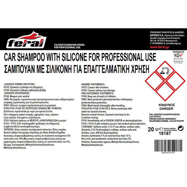 Σαμπουάν Αυτοκινήτου Με Κερί Feral 20lt 1 Τεμάχιο