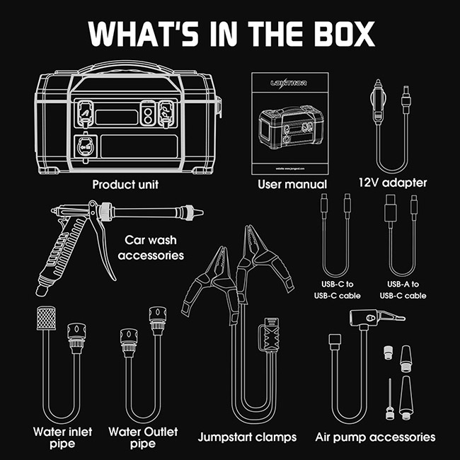 LO-AW401, Σφιγκτήρες εκκίνησης, Προσαρμογέας 12 V, Φουσκωτός εύκαμπτος σωλήνας, Προσαρμογείς ακροφυσίων 4*, Αξεσουάρ πλυντηρίου αυτοκινήτων, Σωλήνας εισαγωγής νερού, Σωλήνας εξόδου νερού, Υποδοχή θηλής, Καλώδιο USB-C, Καλώδιο USB-C σε USB-A, Εγχειρίδιο χρήσης.