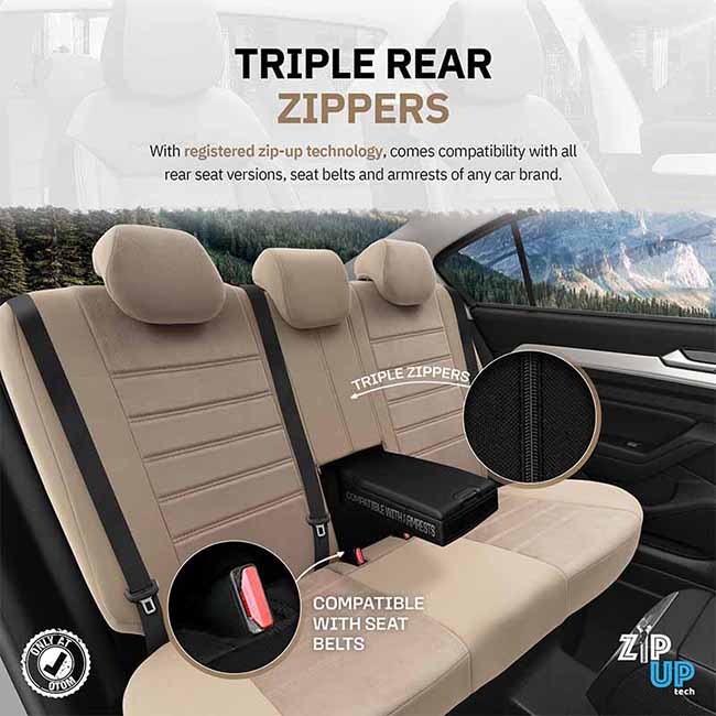 Zip-up Tech: Διαθέτει 3 Φερμουάρ ώστε να προσαρμόζεται στα πίσω καθίσματα είτε είναι διαιρούμενα 60-40 είτε 40-60 είτε 50-50.